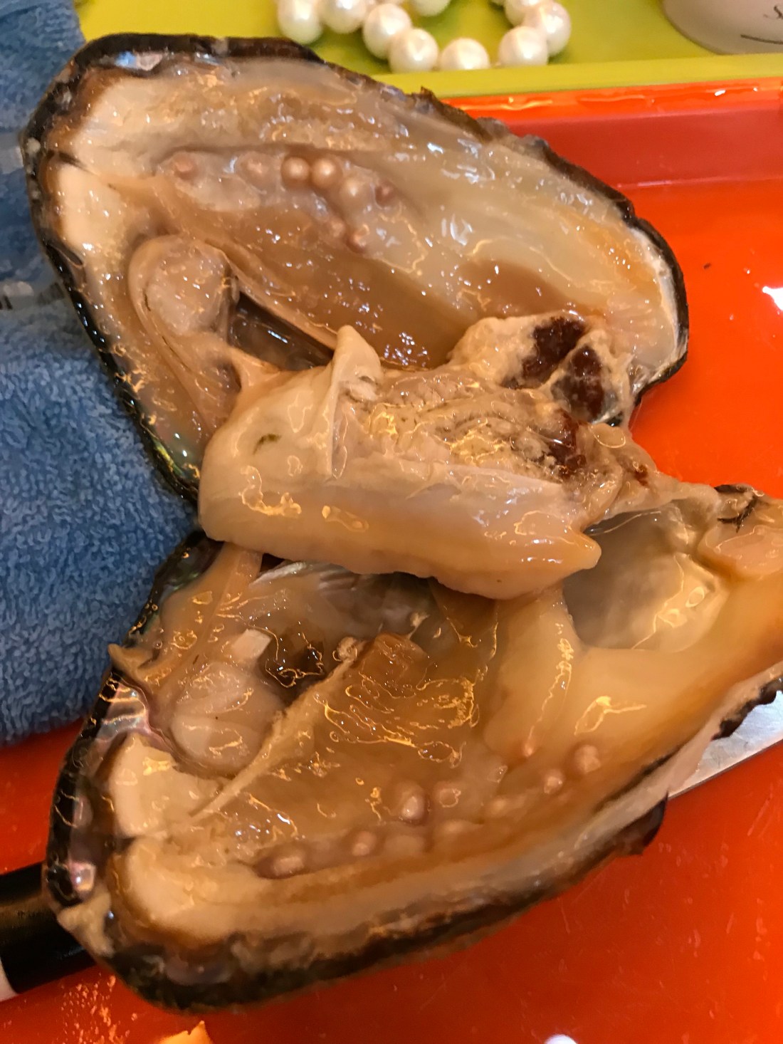 ‘Tina’ arrived to teach us about pearl farming. Oysters containing pearls are triangular in shape and the oyster meat is not for consumption. There are 5 colors of pearls, in the order of least to most rare and expensive: white, pink, purple, black and gold. They get their color by exposure to sun rays. How do you tell if they’re real? No, not your teeth. You rub the pearls together and if they feel rough, they’re real. Smooth? Worthy of the Vera Wang collection. At Kohl’s. On clearance. It was a rather quick demonstration. Here’s the pearl. Ooo ahhh. You go buy now. The last few of us in the room took another look at the open oyster and thought we’d try our hand at the pearl rubbing. I managed to get a quick test in before they saw what we were doing. They did NOT want us testing the pearls. Curious. Again. You go buy now. Government cheese time!