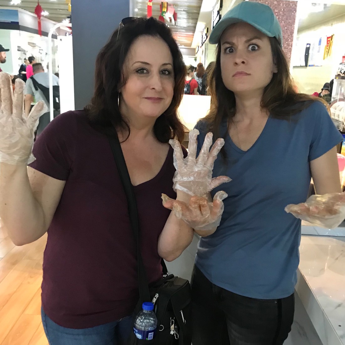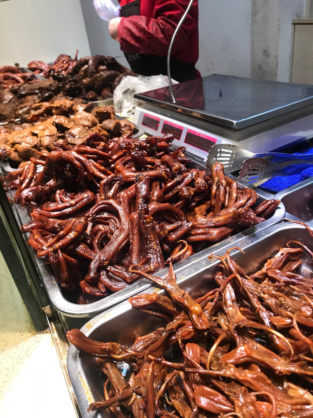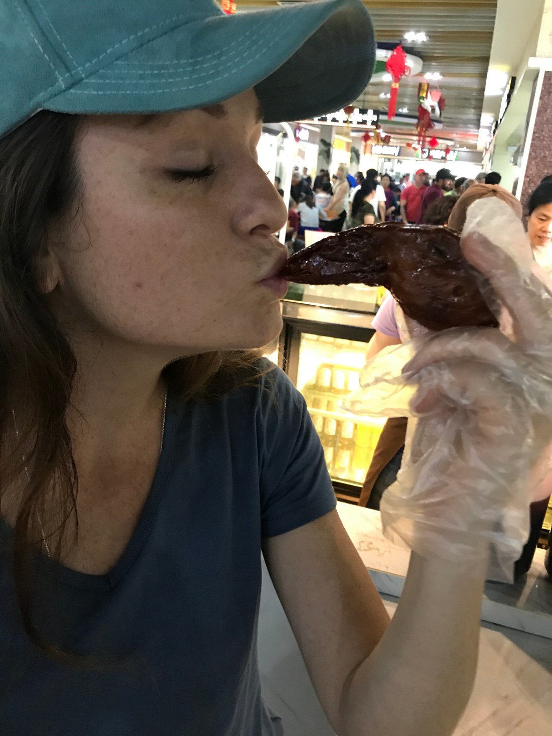 We settled on the bold choice of duck gizzards (only because we thought it was turtle,) a duck tongue, and a duck head. We full-on Aflacked this bitch. Boldly going where no Rindone has gone before, we pulled, chewed and tested our culinary courage. Here to report – it all pretty much tasted like duck. There were bones attached to the tongue so it was a little like eating a wishbone. (We wished for continued unbroken blister packs of Imodium.) The tongue was actually a little spicy. The gizzard was very mild and not at all mealy like your run of the mill truck stop chicken gizzard. Going head to head on the last piece – Clare got cheeky and pulled apart the bill in search of meat. There wasn’t much, but what was there wasn’t scary at all. The only thing we passed on was the eye socket. It was just gooey enough to be reminiscent of a good Rosie (the dog) snot. Hard pass.