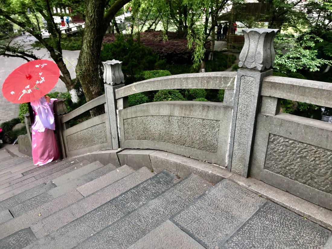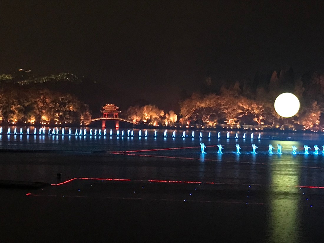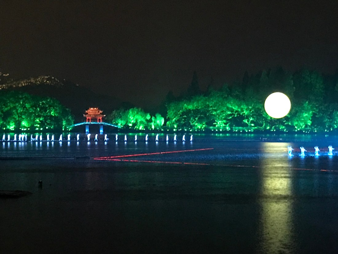 Meal complete and faces cleaned of any debris, we re-enter the park just as it starts to sprinkle for a nighttime show called “Illuminations of West Lake.” It’s a music/dance/light show on platforms that makes it appear the performers are walking on water. We’re ushered to our nose bleed seats -(that’s about right.) As we sit, the sprinkle turns to rain and we’re glad to be under cover. The performance begins and two exquisitely dressed singers on a platform float across the lake. The rain picks up a bit. The background dances pirouette onto the lake — their splashes in the flood lights (pun not intended) is actually cool. As the show continues – the entire lake is filled with lights making the surrounding trees glow and the bridges come alive. The rain has now picked up enough to become a torrent. The singers and dancers are powering through. This is when the people in the front start screaming because the wind has shifted and sheets of rain are drenching them like watermelon at a Gallagher concert. Not making fun of our seat now, are you? They all rush to higher seating. More people floating and a selection from swan lake is performed. Venue employees are rushing into the stands throwing plastic ponchos out for everyone to take. The rain has now reached biblical flood status. How long until the frogs arrive? By the time the white grand piano completely bubbled in plastic being played brilliantly by an umbrella shielded pianist floated by, I realized the Chinese have a far more militant interpretation of ‘the show must go on.’ Slowly the rain slowed to a near stop and the illumination part became clear. Just in time for the finale set to “Ode to Joy.” Like so many t-shirts we see with crazy combinations of English words (Yellow book drugs have, is one head scratching example) I can’t help but believe they have no idea how ironic that song choice is. Show ends. Crowd erupts and we hope for a good night’s sleep after a long day.