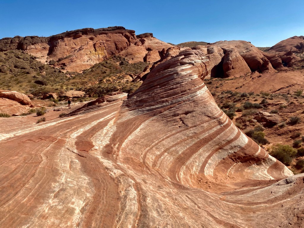We decided to hike it out at the Valley of Fire. A great acclimation state park and so hot it was a little unnerving for what was ahead (so my “what was I thinking” fear set in again). But “The Wave” was well worth it. An easy enough mile down to some absolute glory. Ripples of rock that reminded me a little too much of inescapable cellulite, rocks were so red orange, Jenny (a ginger) blended in.