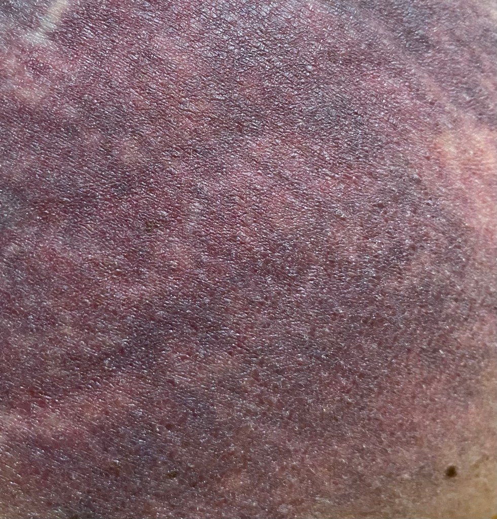 BRUISE UPDATE: double bruised it today in the fall. It’s developing into a deep magenta.